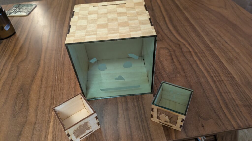 I reduced the depths of the fingers so they’ll remain flush with the 1/8″ plywood and did the kerf calculation again for the new scale. This one didn’t fit together as well, but a bit of glue brought it together. I cut out some acrylic lids for the boxes and engraved some faces that I drew in illustrator.