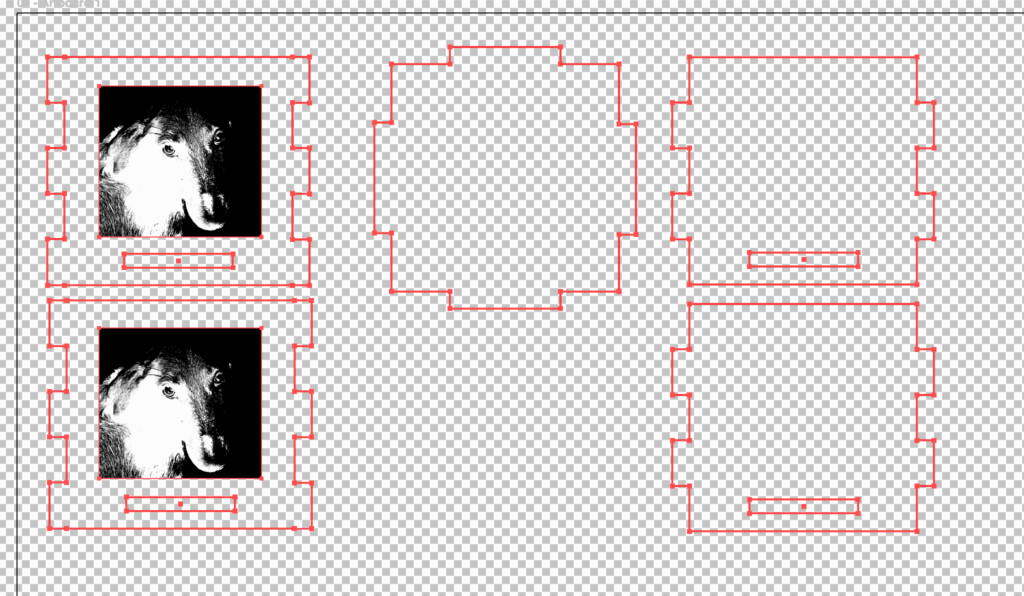 I tried to engrave a picture of my girlfriend’s dog on the sides of the box, but it looked kind of janky. Oh well. I found out later I could have used posterize instead of threshold to capture more grays. I thought the engraving just had a single depth for given set of parameters, didn’t know it could do different levels in a single job. I scaled the smaller design up and added a checkerboard engraving: