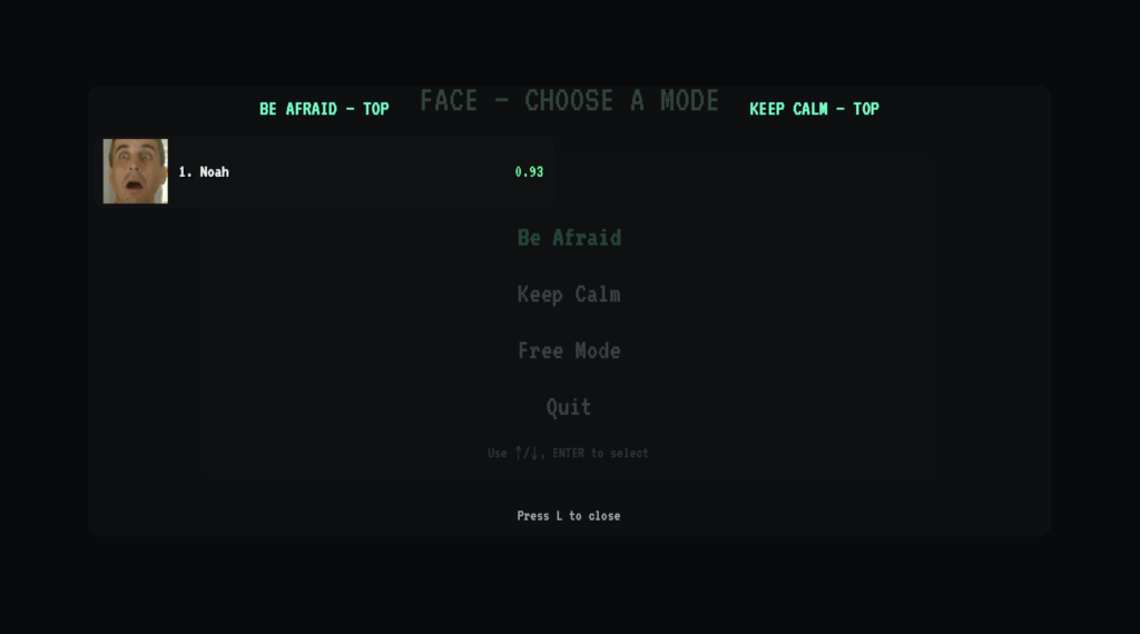 The game grew from a single “be scared” round into three modes: Be Afraid (fill and hold), Keep Calm (same input, opposite goal—don’t let it fill), and Free Mode (a playground that just mirrors the classifier so people can try expressions). We augmented the skinny side bar with a full-screen rising tint that reads in peripheral vision, added chunky retro type, and built summaries with the player’s best “scared” photos and a leaderboard (with thumbnails). We left simple hooks for physical feedback: an LED strip for color cues (blue calm → red danger), and a servo to drop candy or trigger a gotcha moment in Keep Calm.