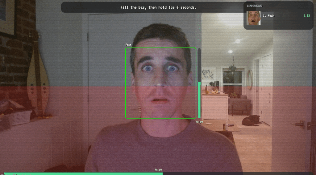 We worked for a while on how to capture the kinds of face we wanted people to make. We started with a blend of many signals; it was fussy and felt arbitrary. The version that clicked used a simple metric: the maximum of the normalized confidence scores for the “fear” and “surprise” emotions. We implemented some configurable hysteresis. The metric is displayed to the user as an on-screen “fright meter.” Later we made the speed of the rise depend on the “arousal” metric mentioned earlier. That made it feel like you’re really pushing on the bar with your expression.