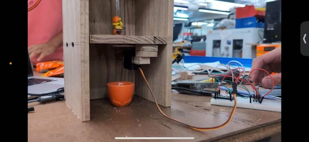 In the second attempt, we used a thicker, solid wood base and secured the structure with screws. We also designed a simple mechanism to fix the servo motor, making it easier to control the release of the candy.