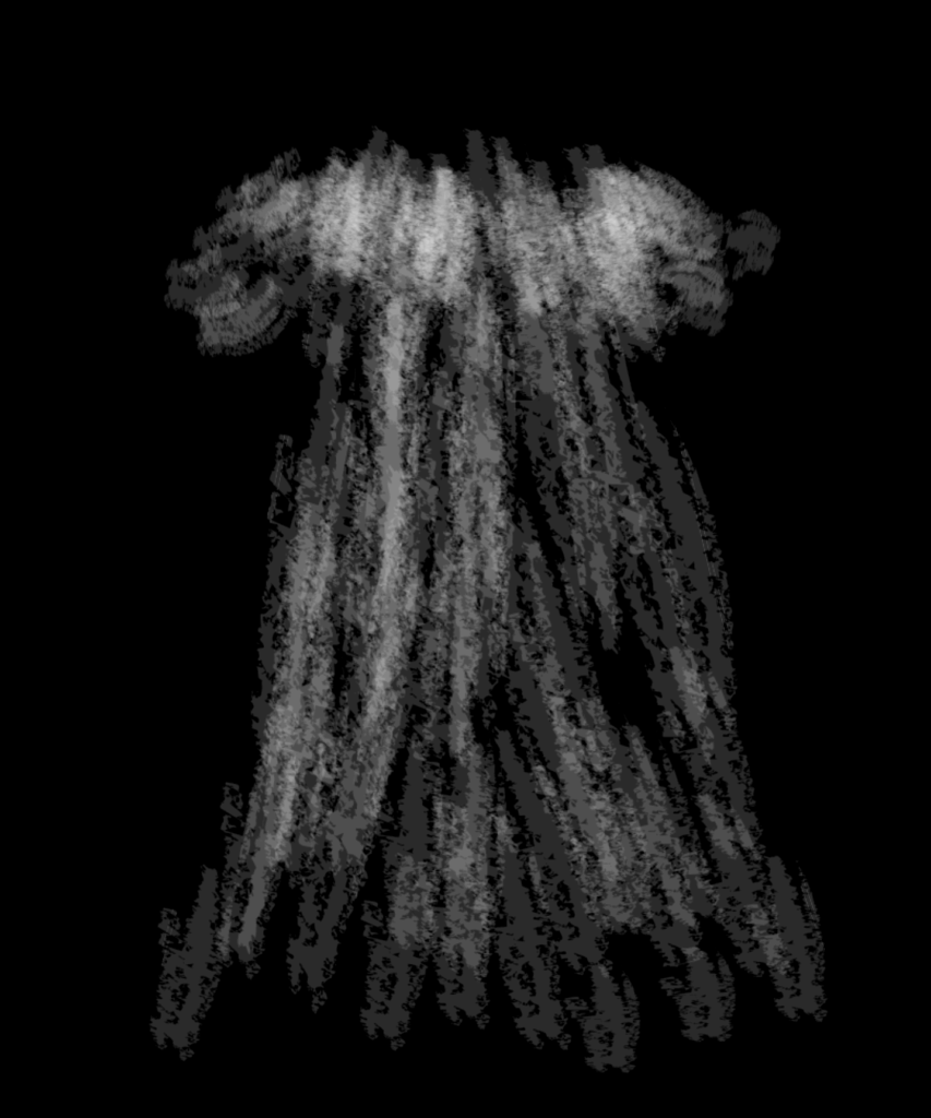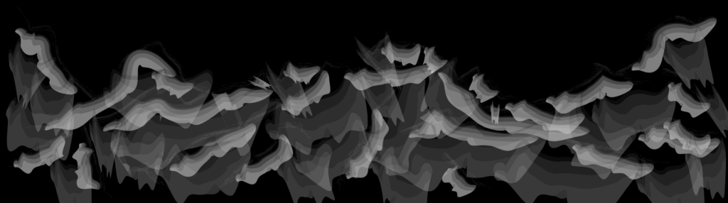 The flying saucers are meant to be the daughters of the air from Andersen’s original tale. The mermaid and prince are simple white silhouettes. For the saucer’s spotlight in the final scene, I used Illustrator’s charcoal brush pattern at half opacity. In the video it glows white while still revealing what’s behind it. The cliffs and mountains were hand-drawn in Illustrator using various brush strokes, colors, and matting techniques.